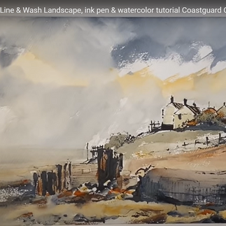 Coastguard Cottages in ink pen and watercolour by Lois Davidson via zoom