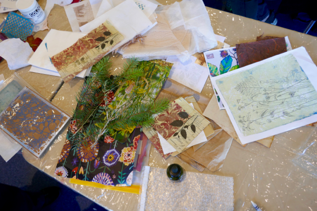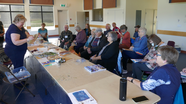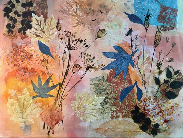 with contributions by Brenda Pon - a semi abstract on the subject of “Autumn“. The base was a gridded soft wash of acrylic using a restricted palette of complimentary colours. Imposed on this were layers of collage, printing and washes of ink. The drawings were done in acrylic ink. Some areas were textured with acrylic medium. The abstract contained a base of acrylic which was dried with Saran Wrap on it and alcohol drips, collage and oil pastel were layered on top.